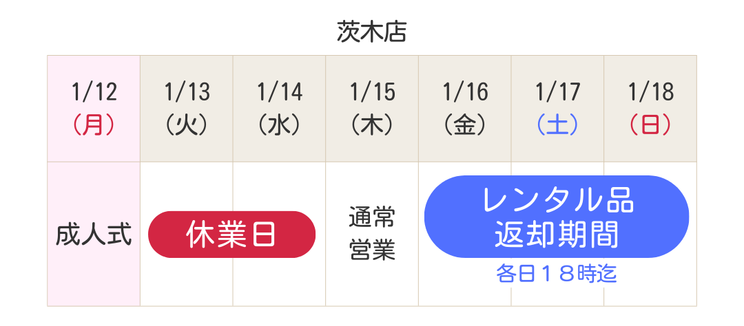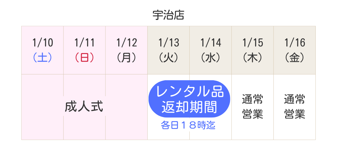 宇治店TEL 宇治店LINE 茨木店TEL 茨木店LINE※茨木店・振袖館は1月13日(火)・14日(水)休業させて頂きます。(宇治店は通常営業)