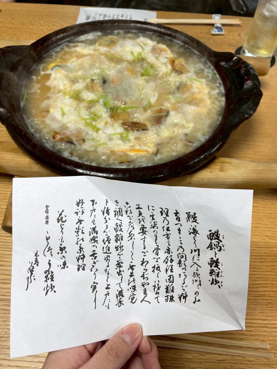 お食事もうなぎを雑炊で食べるのも初めてで、うなぎの白焼きを食べるのも初めて美味しかったです!